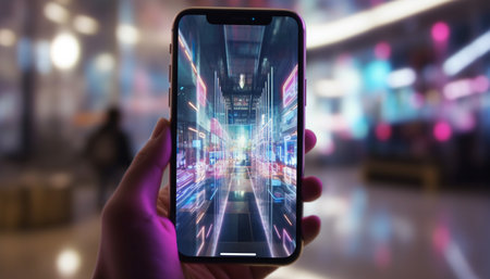 Hand holding mobile phone, capturing illuminated city nightlife with digital display generated by artificial intelligence