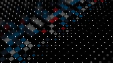Abstract mosiac motion, geometric pattern. Animation. Colorful squares and tiny crosses appear in many rows on black background and flowing in diagonal trajectory.