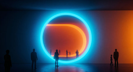 Silhouette of a group of people walking in front of a neon circle.