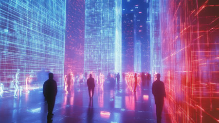 Towering skyscrapers form a network of interconnected pathways teeming with holographic workers symbolizing innovation and collaboration in a growing economy