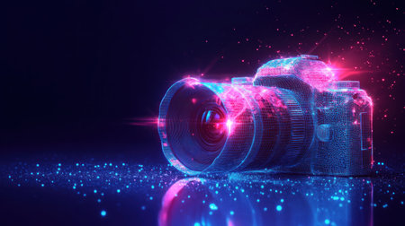 Futuristic Camera, Glowing Particles, Dark Background, Reflection