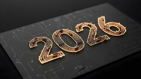 The numbers 2026 designed as a circuit board with golden traces on a dark surface. Clear details ...