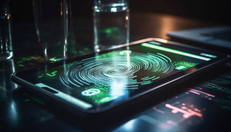 Futuristic laboratory equipment analyzing glowing blue liquid on computer monitor generated by artificial intelligence
