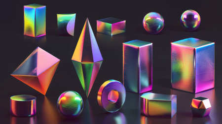 Various smooth, iridescent geometric shapes float in a dark space, reflecting rainbow colors and illuminated by soft, glowing lights.