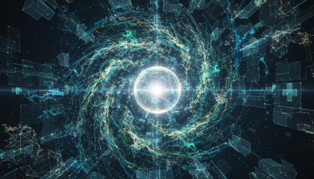 Bright lights spin in a circular motion around a central orb. The scene shows data patterns and movements, creating a sense of motion and depth in a digital space.