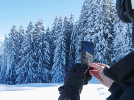 Women in winter clothing, fingerless mittens and ornamented hat photographing snowy forest by a mobile phone. Shallow dof. Focus on hand.