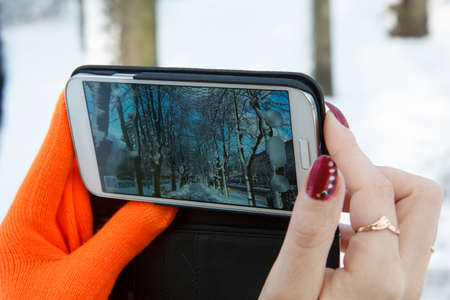 female hand takes picture by smartphone with cutout screen in winter forest