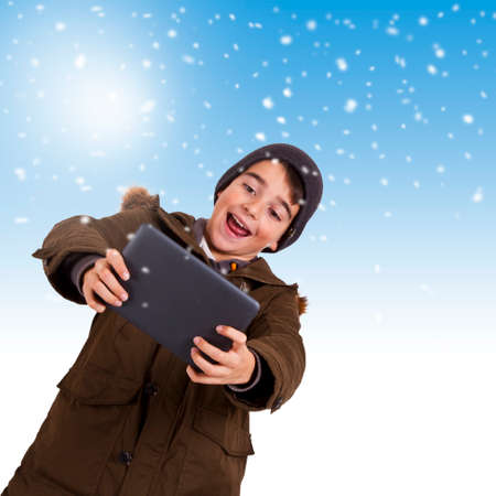Child with tablet and snowing sky