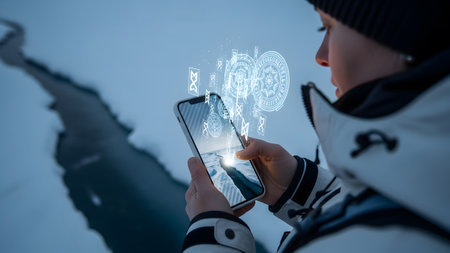 showing close-up of a person in winter clothing holding a smartphone with holographic...