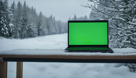 A laptop computer sits on a snowy wooden table, with a green screen displaying the winter forest behind.