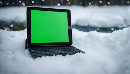 A tablet with a green screen sits in a snowy landscape, capturing the beauty of a winter wonderland.
