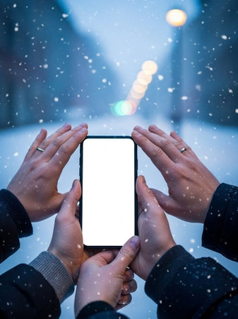Mockup image of hands holding smartphone with blank screen over snowy background