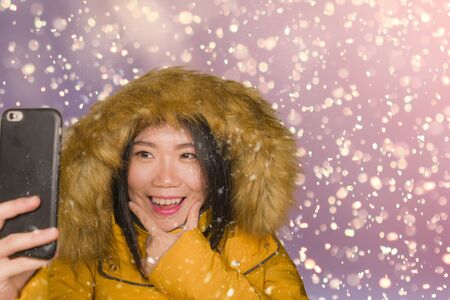 young beautiful and happy Asian Chinese woman in hood winter jacket taking selfie portrait with mobile phone outdoors under the snow smiling cheerful enjoying Christmas holidays trip