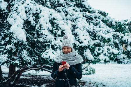 Beautiful young woman using smartphone and wearing scarf and a a hat on a cold winter day during snow