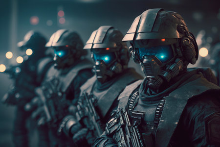 Futuristic soldiers wearing high-tech armor and helmets with glowing visors standing in formation