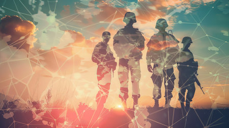 A dramatic image of United States military heroes silhouetted before the nation's flag, celebrating Veterans Day, Memorial Day. Generative AI