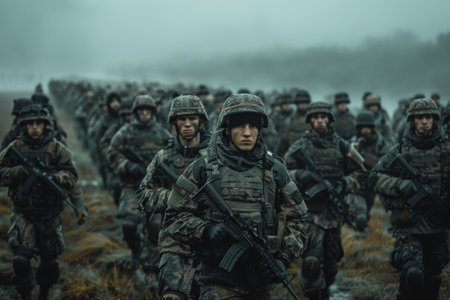 Troops in Camouflage Marching Through Foggy Terrain in a Military Exercise of Endurance and Strategy.
