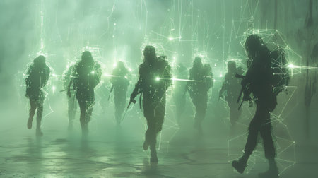 A group of soldiers walking through a foggy area with wires connecting them, AI