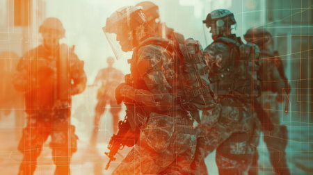 A group of soldiers in camouflage uniforms stand in a modern city setting, their faces obscured by helmets and tactical gear. They are in a state of high alert, their weapons ready. The image is rendered in a futuristic style with digital grid overlay, creating a sense of urgency and mystery.
