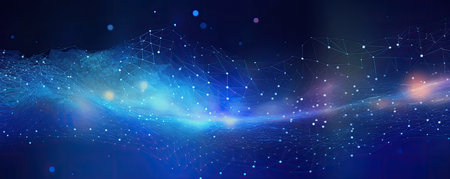 Panorama of Striking business background with a grid of interconnected dots in various shades of blue, conveying connectivity, innovation, and futuristic vibes