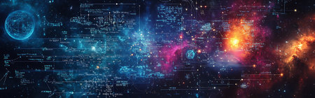 A vibrant and abstract digital representation of the universe featuring neon glowing elements and intricate mathematical formulas. Ideal for science, technology, and abstract art themes.