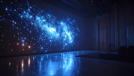 Vibrant holographic backdrop showcasing cosmic stars in a spacious setting