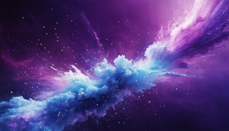 A stunning nebula showcases brilliant shades of blue, purple, and orange, revealing cosmic gas and stars in deep space.