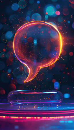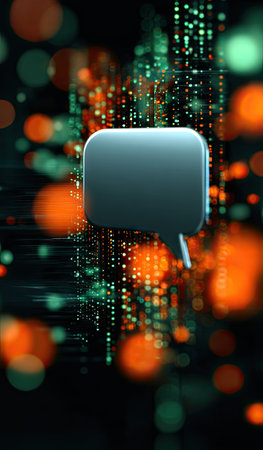 An illustration depicts a 3D speech bubble floating against a backdrop of glowing digital data streams. The scene features a dark ambiance with vibrant orange and green bokeh lights, suggesting a high-tech or futuristic environment. It could be used in various commercial applications related to communication, data, or technology.