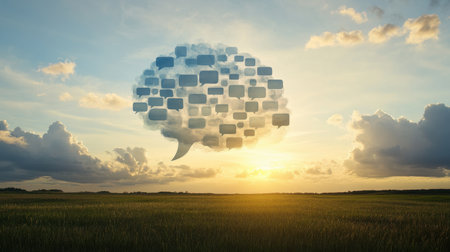 A captivating conceptual image featuring a speech bubble made of clouds against a vibrant sunset, symbolizing communication and creative ideas in nature.