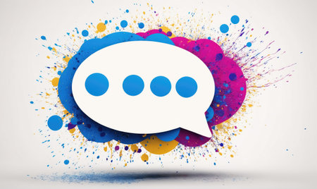 A white speech bubble with four blue dots sits on a colorful background of splatter paint