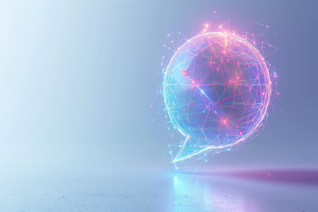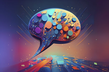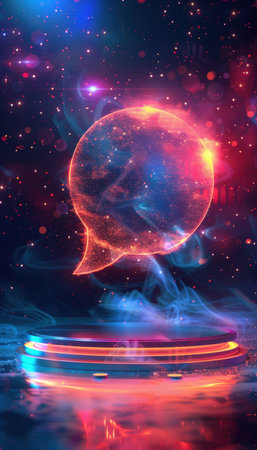 An illustration features a blank speech bubble overlaid on a complex digital background. The scene showcases a combination of glowing lines, text, and vibrant light. This imagery suggests modern communication, potentially suitable for tech-related themes or conceptual design projects, adaptable for various editorial or commercial purposes.