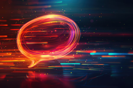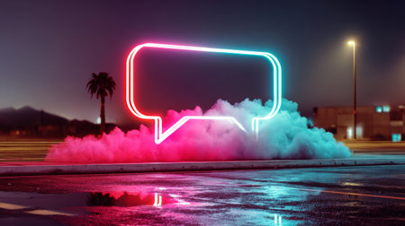 A glowing neon speech bubble icon surrounded by colorful smoke creates vibrant atmosphere. This artistic representation is perfect for communication themes