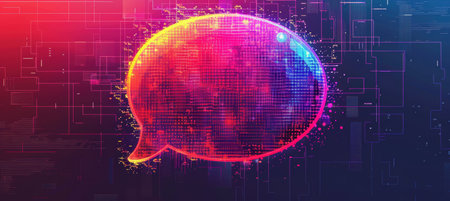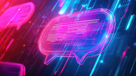 Vibrant and futuristic chat bubbles filled with digital code create a dynamic visual. This stunning graphic illustrates modern communication concepts through glowing neon effects.