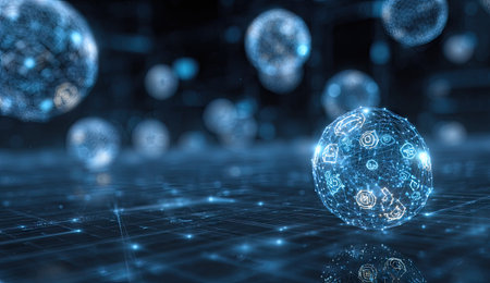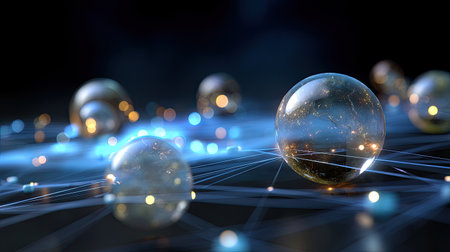 This captivating image features transparent spheres illuminated by blue light on a dark surface, symbolizing technology and interconnectedness in a futuristic setting.