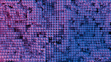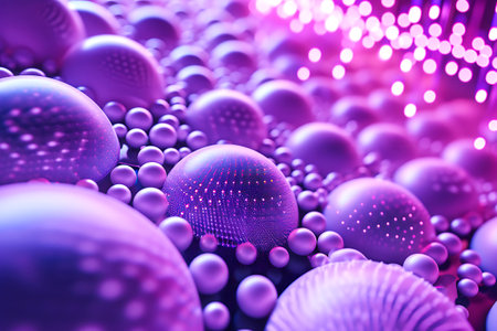 Lots of spheres with neon dots texture on a purple background, creating a fairy tale effect. Horizontal illustration