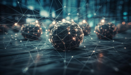 This image features several glowing spheres with an intricate network of interconnected lines. The spheres are primarily blue and white with a blurred background. The overall style suggests a futuristic or scientific theme. The image may be suitable for use in technology-related projects, educational resources, or as a visual component in various design contexts.