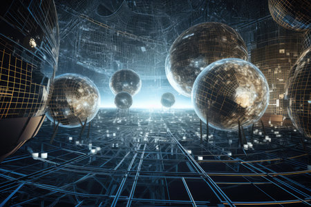 This stunning abstract image features illuminated spheres and vibrant lines, creating a dynamic interplay of light and depth in a cosmic setting.