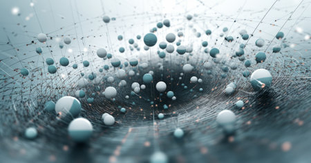Futuristic abstract background featuring chrome spheres and glitter in dark space