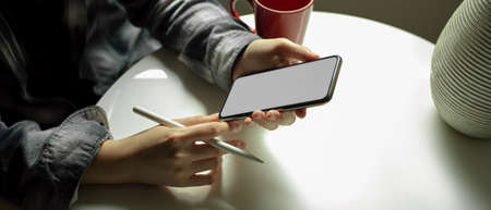 Cropped shot of female freelancer using mock-up smartphone while sitting at coffee table beside window in living room