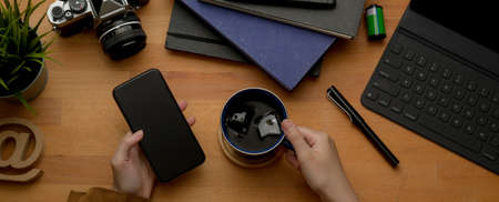 Overhead shot of female hand using smartphone and holding coffee cup on rustic worktable with office supplies