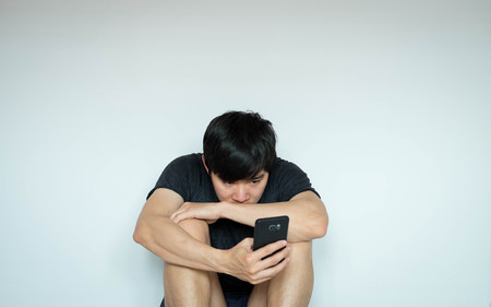 The young man sitting on the bed holding a tablet. Sad and Tired Asian Young businessman with Tablet.