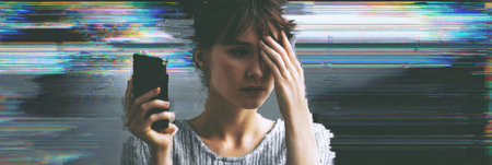 A person holds a corrupted smartphone, showing a sense of anxiety and emotional turmoil. The blurred visuals emphasize feelings of disconnection and stress.