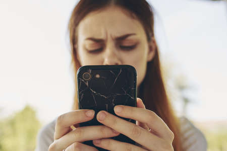 red-haired woman with a phone in her hands outdoors