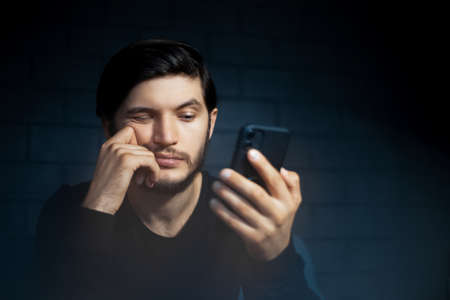 Portrait of a thoughtful-serious man on a black background with a phone in his hands. Space for text.