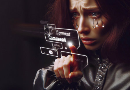 Closeup picture of frustrated girl, young woman being a victim of bullying online