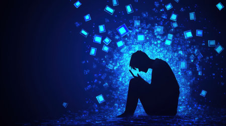 A striking image of a young person seated in a dark space, illuminated by floating blue screens, symbolizing the emotional struggles connected to technology and social media.