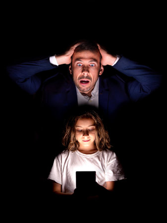 A girl looking at a cell phone and a concerned parent, symbolizing concern for online safety.