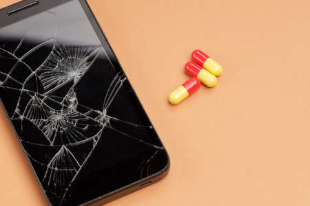 broken phone and medications in the form of pills on an orange surface. drugs for depression