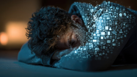 A young man rests peacefully while digital icons emanate from his arm, symbolizing the intersection of humanity and technology. The image conveys creativity and connection.