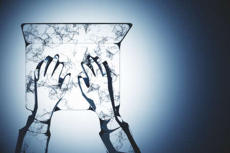 Cyber security concept. Broken glass with digital icons. 3d rendering